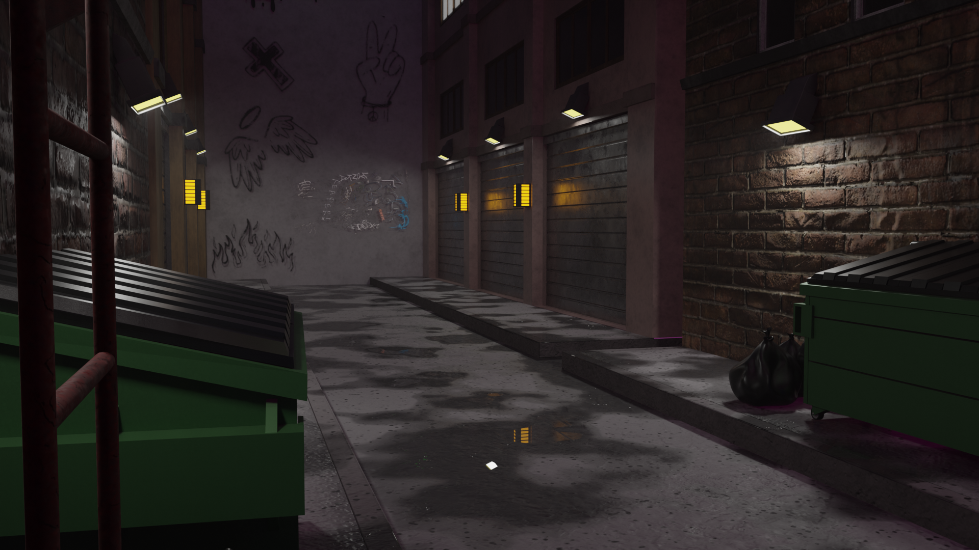 Dead End: Forgotten or… dangerous? Immerse yourself in this dark urban alley, where the neon signs reflect on the wet asphalt and each piece of graffiti tells a story. This project is a study of atmospheric lighting, environmental storytelling, and realistic PBR texturing. Each puddle of water and volumetric light was created to build a cinematic and immersive scene..